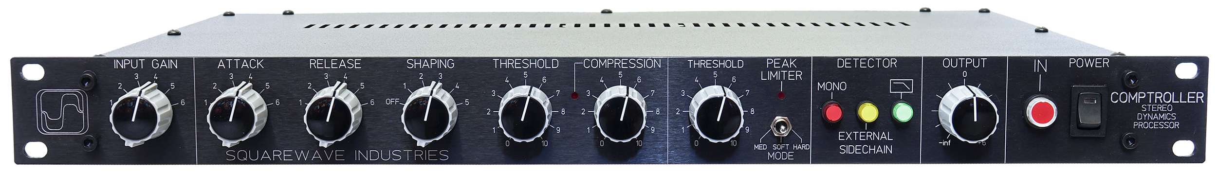 Input Gain, Attack, Release and Shaping are all on 6 position rotary switches. Threshold, Compression and Output are continuous potentiometers. Instead of a traditional meter, single LEDs indicate when compression and peak limiting are active. This is based on the simple premise that if you can't hear what it's doing, then you're not using it right.